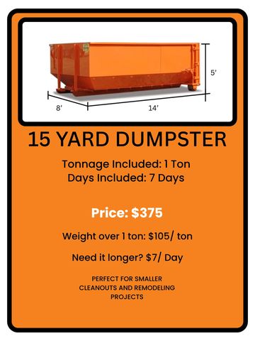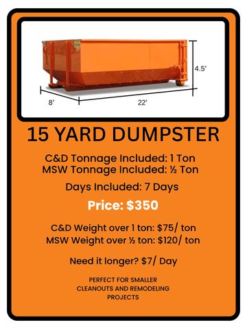 From October 1st 2025 thru October 31st 2025, you can rent a 30YD roll off dumpster for only $410. 7 days and 1 ton included!